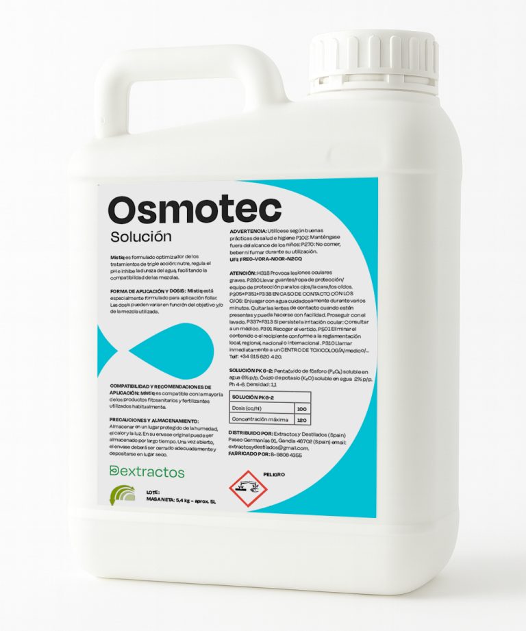Gracias a su composición equilibrada, Osmotec favorece la síntesis de proteínas, la actividad enzimática y la integridad de las membranas celulares, contribuyendo a una mejor absorción de agua y nutrientes. Esto se traduce en cultivos más vigorosos, con mayor capacidad de recuperación y rendimiento estable.